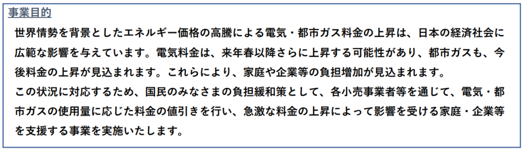 - 電気料金・都市ガス料金の上昇が予測され、家庭や企業等の負担増加が見込まれます。この状況に対応するため、電気・都市ガスの使用量に応じた料金の値引きを行い、急激な料金の上昇によって影響を受ける家庭・企業等を支援する
